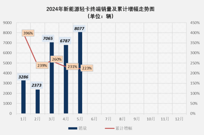 2024年,新能源轻卡行业在“金三银四”传统销售旺季中取得了辉煌成绩,销量分别达到了7000辆和6500辆,与去年同期相比,增幅分别达到了惊人的280%和187%。截至4月底,累计销量的同比增幅更是高达231%,展现出该行业的蓬勃生机与持续向好的态势。