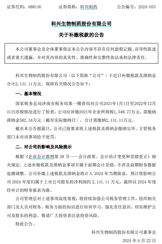 6月21日晚间,科创板公司科兴制药公告,公司于近日补缴税款及滞纳金合计2131.11万元。